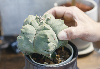 体内に水分を蓄えているサボテンは、水分が不足するとやわらかくなる特徴が。指で軽く押してみて、やわらかく感じたら水やりのタイミングです。