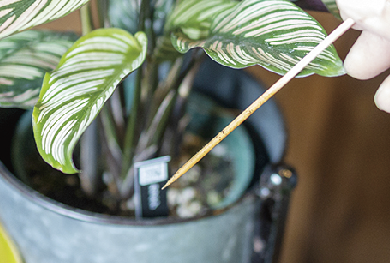 体見た目だけではわかりにくい土中の乾き具合。そんな時は竹串を土に適度な深さまで差し込み、抜いて湿った土がついていなければ、水やりのサインです。
