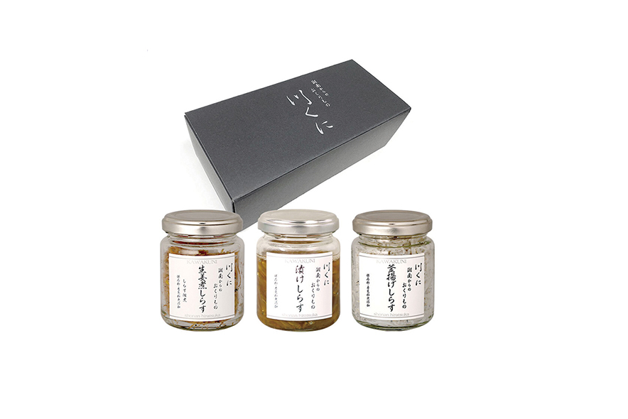 獲れたて湘南しらすを特製ダレに漬けた、湘南ひらつか名産品「漬けしらす」。さらに、烏賊の塩辛や生姜煮しらすなど、素材の旨みを活かす川国ならではの味わいを贈り物に!